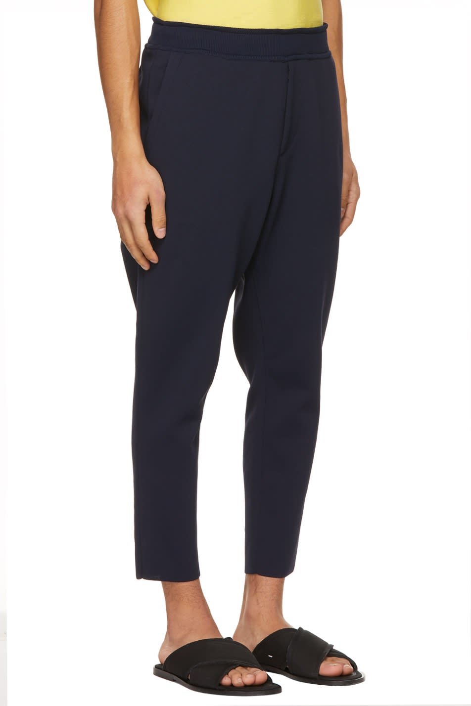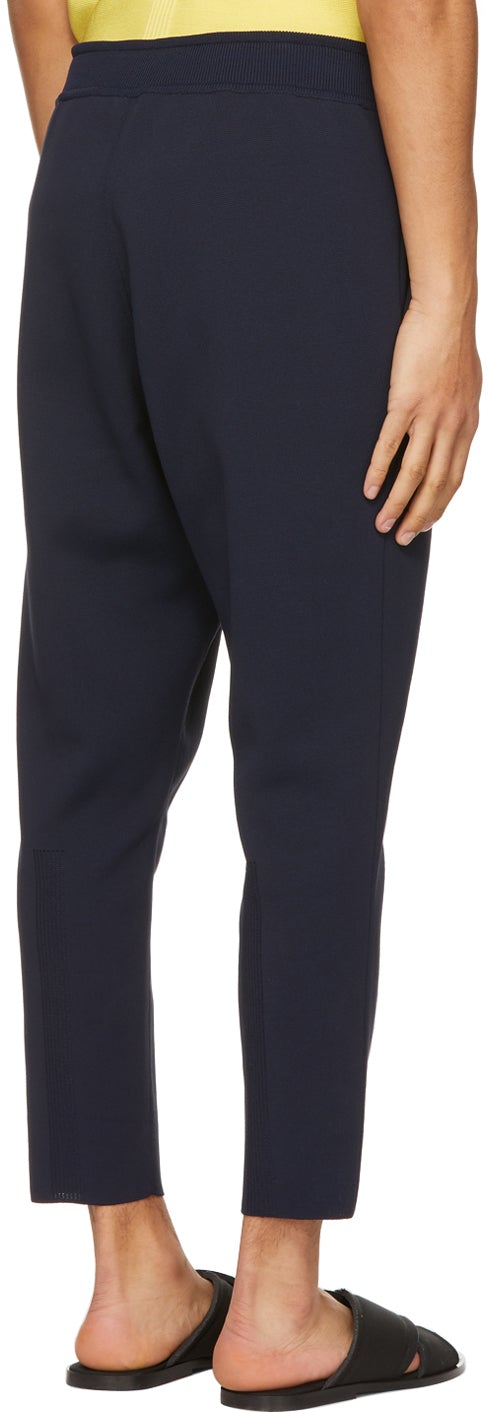 Tapered jersey trousers in navy. Mid-rise. Two-pocket styling. Concealed drawstring and rib knit trim at elasticized waistband. Rib knit trim at front pockets. Rib knit detailing at back legs. Zip-fly. Supplier color: Navy 80% polyester, 20% recycled polyester. Brand: CFCL