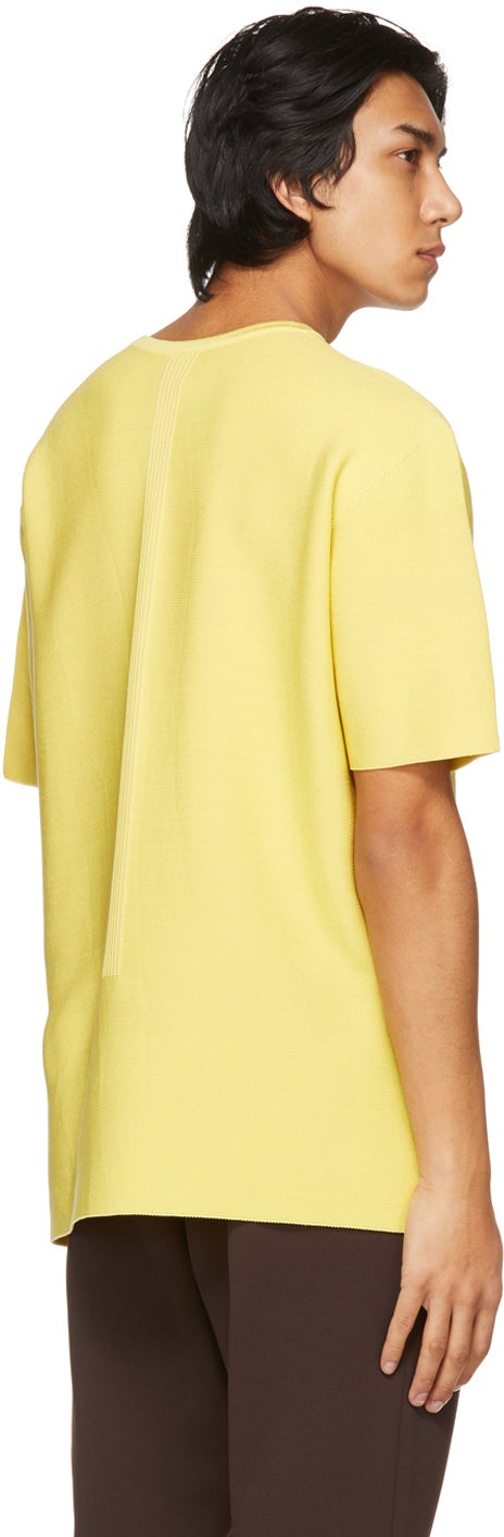 Half sleeve knit cupro-blend T-shirt in yellow. Rib knit crewneck collar. Rib knit detailing at back. Tennis-tail hem. Supplier color: Yellow 45% cupro, 29% polyester, 26% recycled polyester. Brand: CFCL