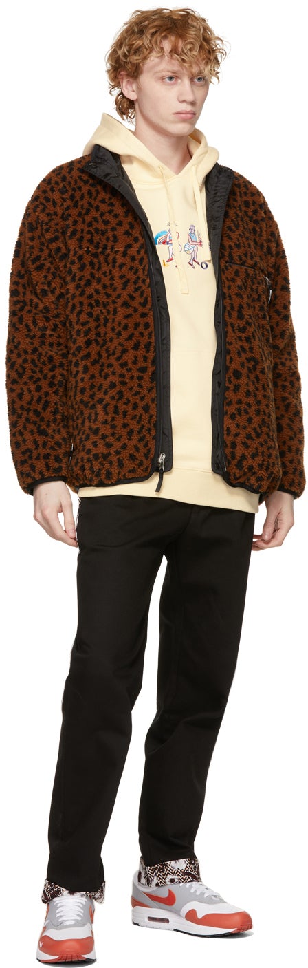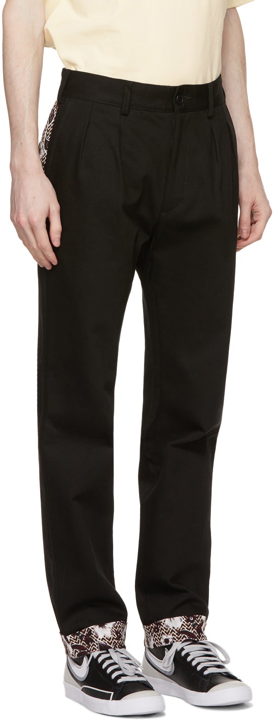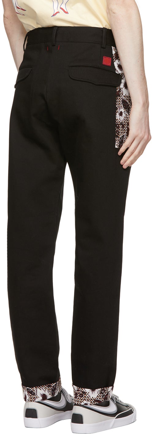 Straight-leg cotton twill trousers in black. Mid-rise. Four-pocket styling. Belt loops at waistband. Pleats at front waistband. Topstitching in red at back waistband. Textile logo patch in red at back pocket. Cotton jersey trim featuring multicolor graphic pattern at back and rolled cuffs. Zip-fly. Black and silver-tone hardware. Supplier color: Black 100% cotton. Brand: Clot