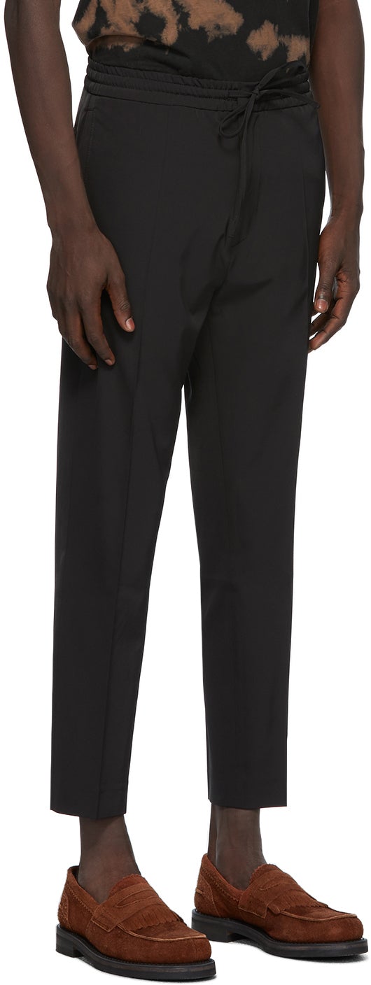 Tapered stretch gabardine trousers in black. Mid-rise. Four-pocket styling. Drawstring at elasticized waistband. Central creases at front and back. Zip-fly. Tonal hardware. Supplier color: Black 90% polyester, 10% elastane. Brand: CMMN SWDN