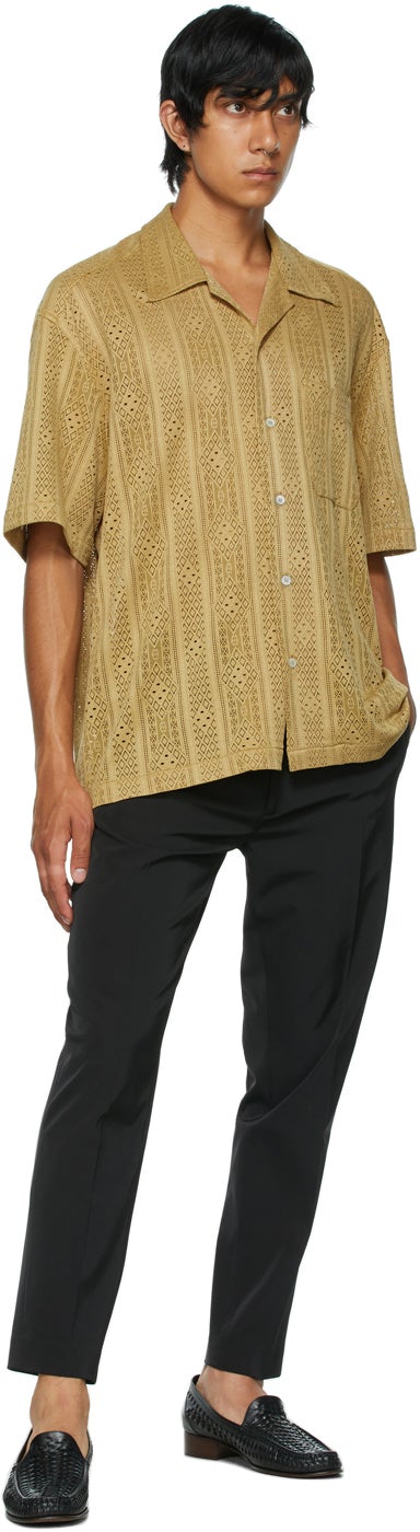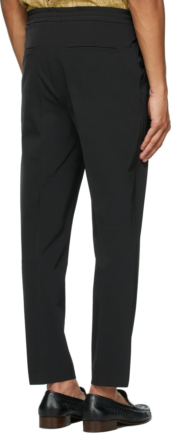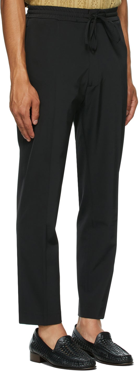 Tapered stretch gabardine trousers in black. Mid-rise. Four-pocket styling. Drawstring at elasticized waistband. Central creases at front and back. Zip-fly. Tonal hardware. Available exclusively at SSENSE. Supplier color: Black 95% polyester, 5% elastane. Brand: CMMN SWDN