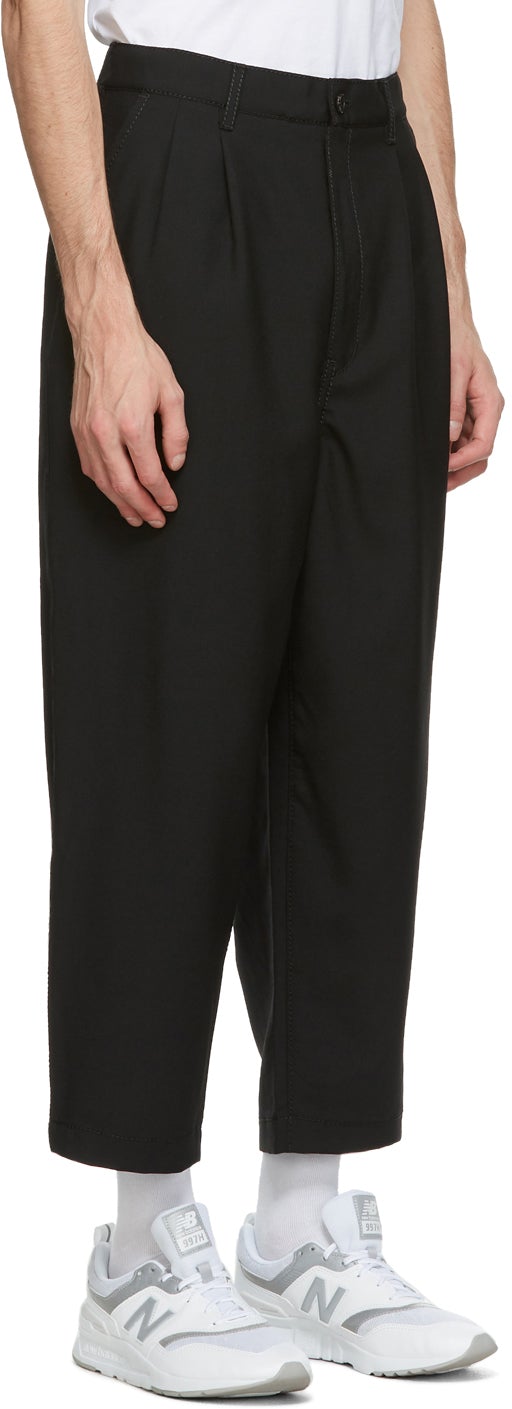 Relaxed-fit tropical wool trousers in black. Mid-rise. Dropped inseam. Four-pocket styling. Belt loops at waistband. Pleats at front waistband. Tonal satin lining. Partially lined. Zip-fly. Supplier color: Black Body: 100% wool. Lining: 100% cupra. Brand: Comme des Garçons Homme