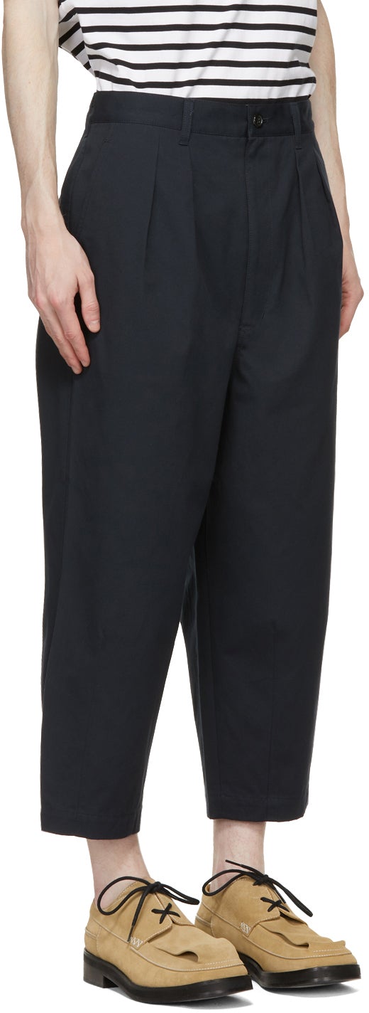 Tapered cotton canvas trousers in navy. Mid-rise. Four-pocket styling. Belt loops at waistband. Pleats at front waistband. Darts at back waistband. Darts at cuffs. Zip-fly. Tonal hardware. Supplier color: Navy 100% cotton. Brand: Comme des Garçons Homme