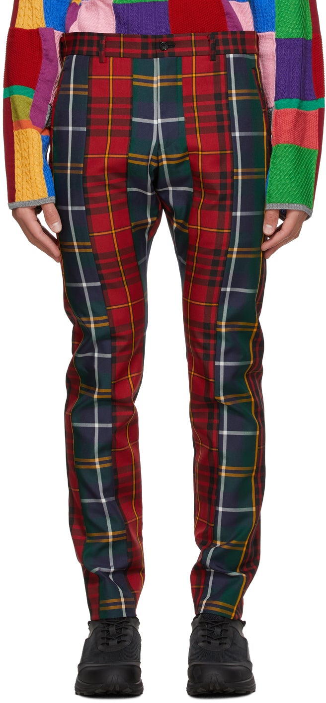 Slim-fit panelled twill trousers featuring check pattern in red, black, and yellow. Mid-rise. Four-pocket styling. Belt loops at waistband. Partially lined. Zip-fly. Supplier color: Red/Green Body: 100% polyester. Lining: 100% cupra. Brand: Comme des Garçons Homme Plus
