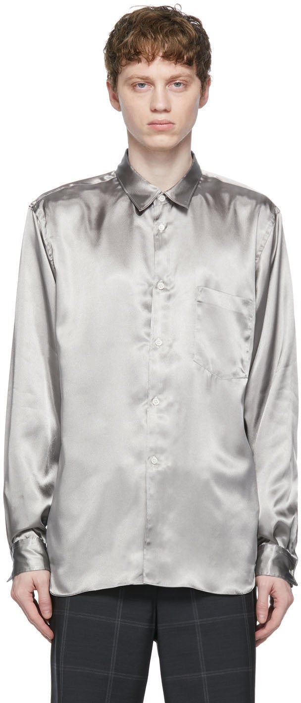 Long sleeve titanium-coated satin shirt in silver-tone. Spread collar. Patch pocket at chest. Single-button barrel cuffs. Shirttail hem. Supplier color: Silver 100% polyester. Brand: Comme des Garçons Homme Plus