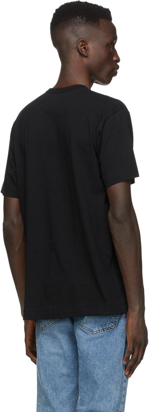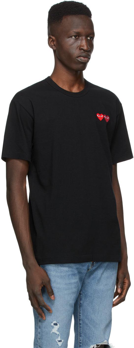 Short sleeve cotton jersey T-shirt in black. Rib knit crewneck collar. Signature embroidered graphic appliqués in tones of red, white, and black at chest. Supplier color: Black 100% cotton. Brand: Comme des Garçons Play