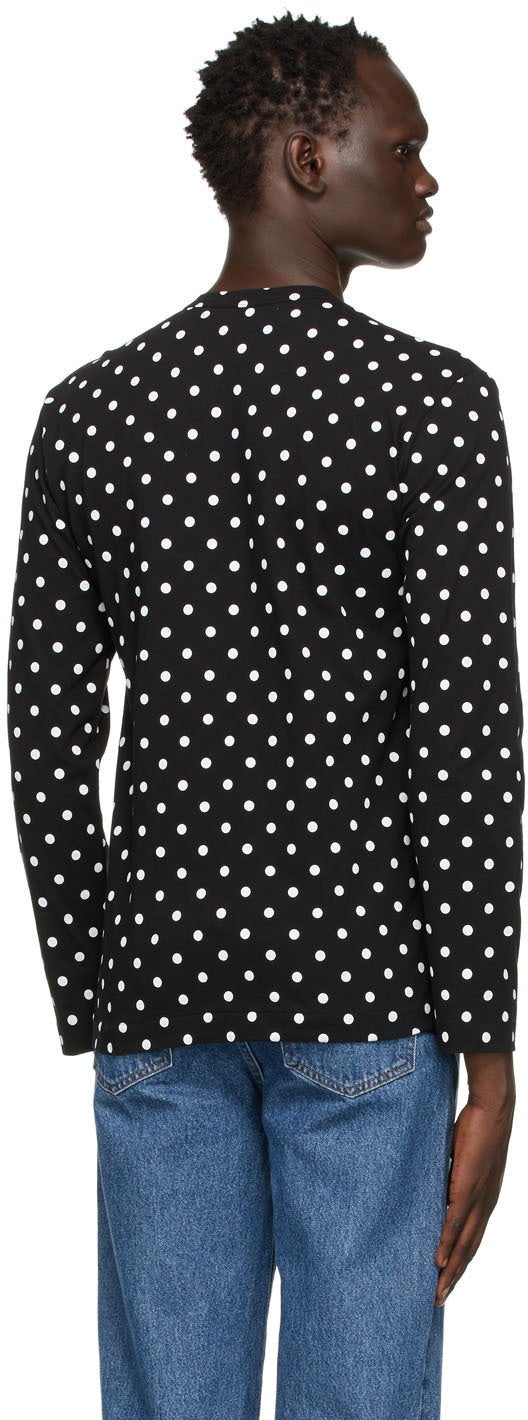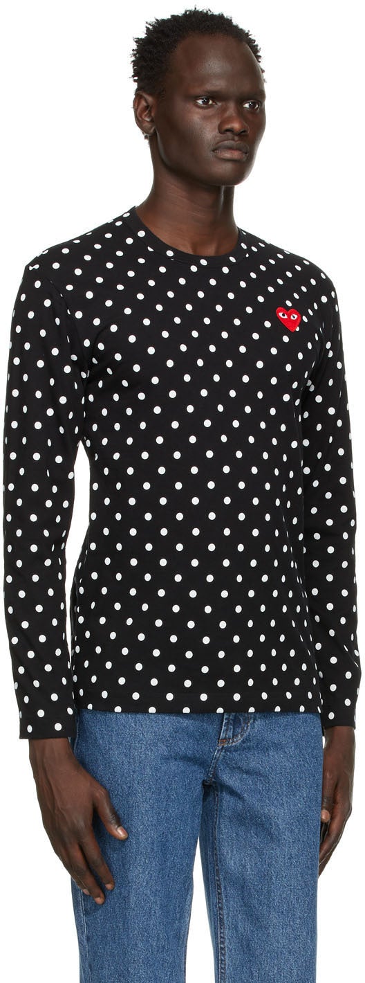 Long sleeve cotton jersey T-shirt featuring graphic pattern printed in white throughout. Rib knit crewneck collar. Signature embroidered graphic appliqué in red, white, and black at chest. Supplier color: Black/White 100% cotton. Brand: Comme des Garçons Play