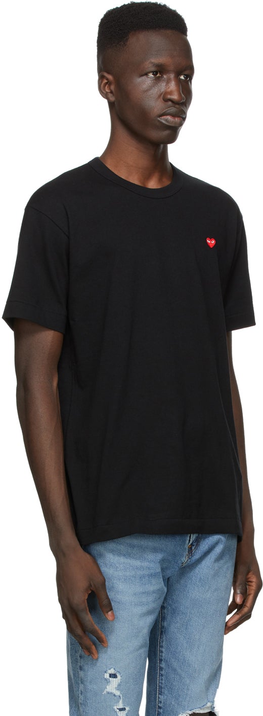 Short sleeve cotton jersey T-shirt in black. Rib knit crewneck collar. Signature embroidered graphic appliqué in red, white, and black at chest. Supplier color: Black 100% cotton. Brand: Comme des Garçons Play