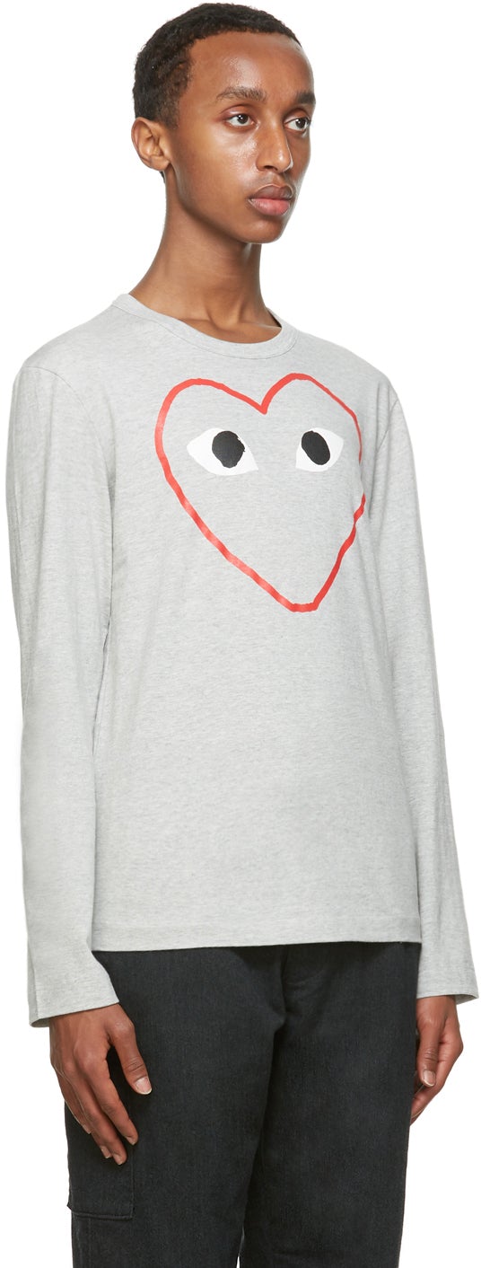Long sleeve cotton jersey T-shirt in grey. Rib knit crewneck collar. Signature graphic printed in red, white, and black at chest. Supplier color: Grey 100% cotton. Brand: Comme des Garçons Play