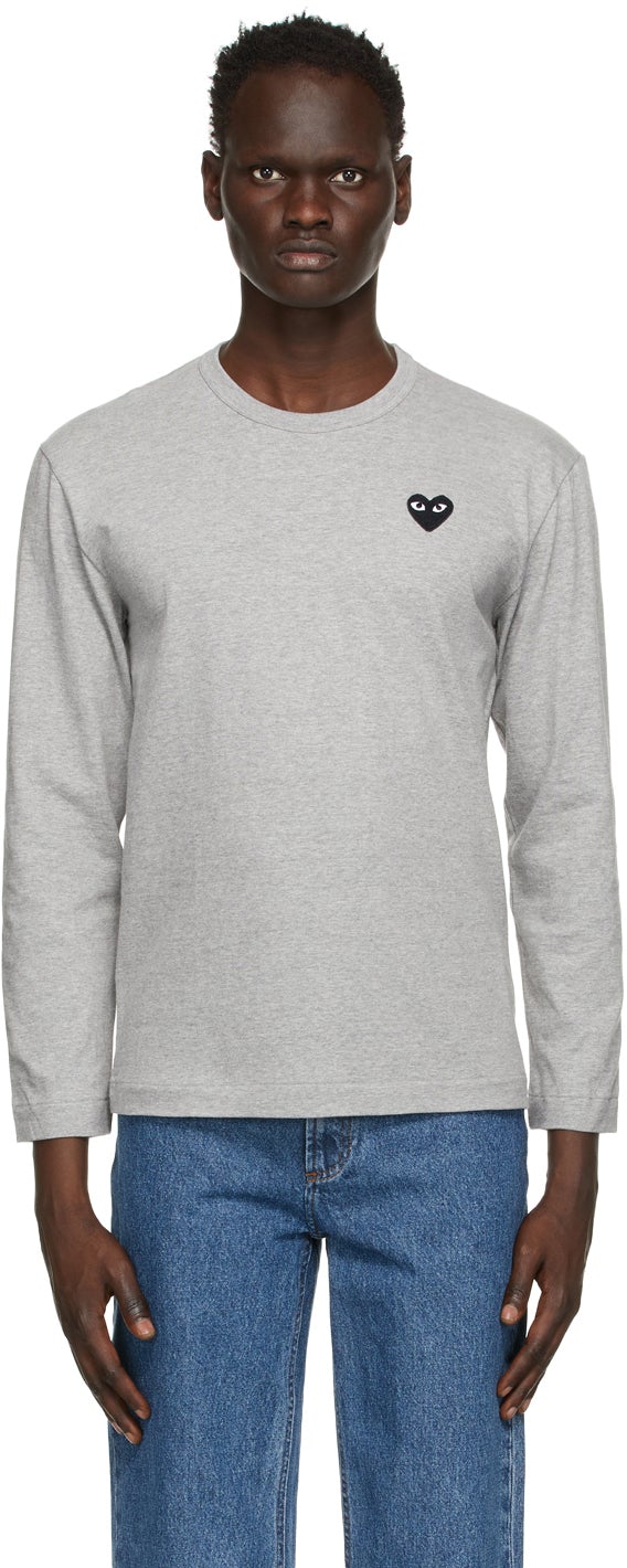 Long sleeve cotton jersey t-shirt in grey. Rib knit crewneck collar. Signature embroidered graphic appliqué in black at chest. Supplier color: Grey 100% cotton. Brand: Comme des Garçons Play