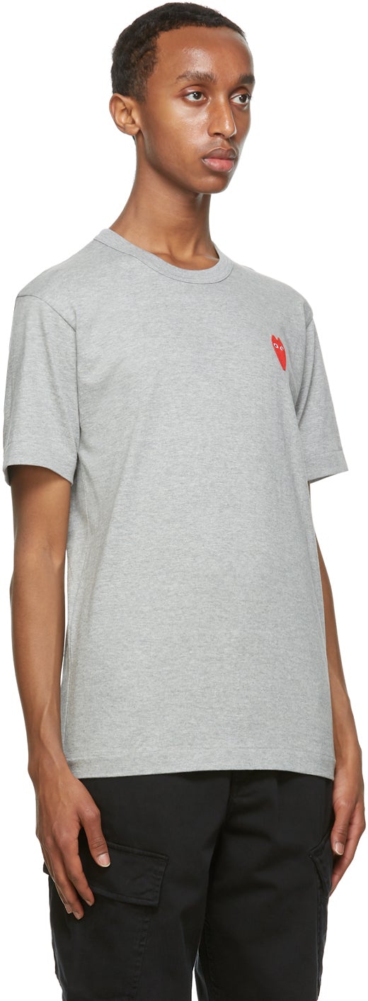 Short sleeve cotton jersey T-shirt in grey. Rib knit crewneck collar. Signature graphic embroidered in red, white, and black at chest. Supplier color: Grey 100% cotton. Brand: Comme des Garçons Play