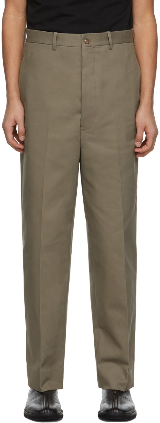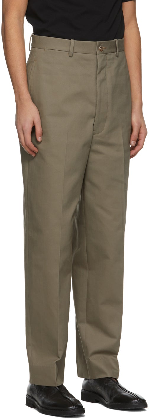 Relaxed-fit cotton twill trousers in grey. High-rise. Five-pocket styling. Belt loops at waistband. Central creases at front and back. Transparent rubberized logo patch at outseam. Button-fly. Supplier color: Cement grey 100% cotton. Brand: Connor McKnight