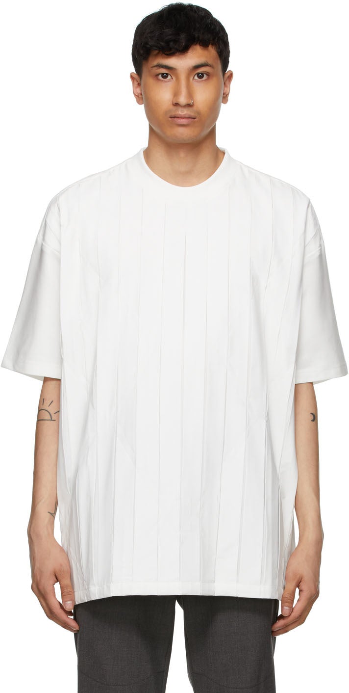 Short sleeve bamboo fibre-blend poplin and cotton jersey T-shirt in white. Paneled construction. Rib knit crewneck collar. Pleats and tonal embroidered graphic pattern at front. Supplier color: White Body 1: 49% bamboo fibre, 49% polyethylene terephthalate, 2% spa. Body 2: 85% cotton, 15% polyethylene terephthalate. Brand: Cornerstone