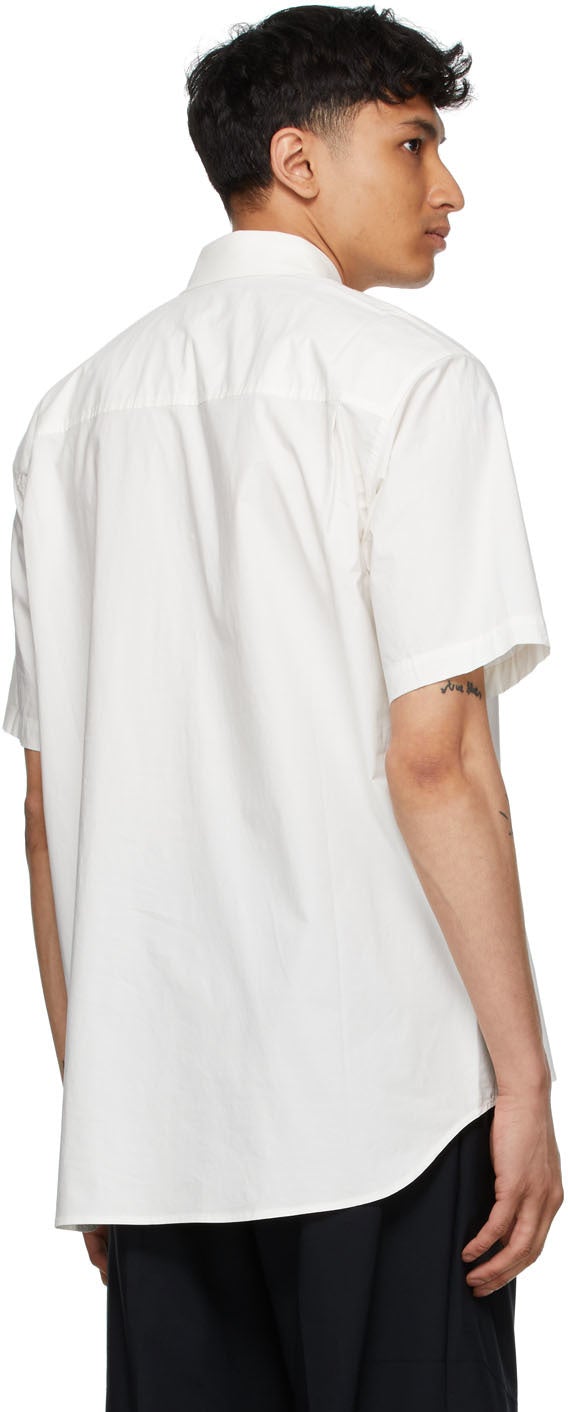Short sleeve stretch cotton poplin shirt in white. Spread collar. Concealed button closure at front. Patch pocket with tonal bonded trim featuring graphic pattern at chest. Twin pleats at back yoke. Rounded drop-tail hem. Tonal hardware. Supplier color: White 98% cotton, 2% spa. Brand: Cornerstone