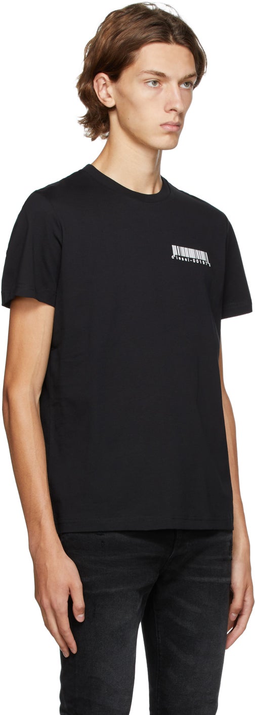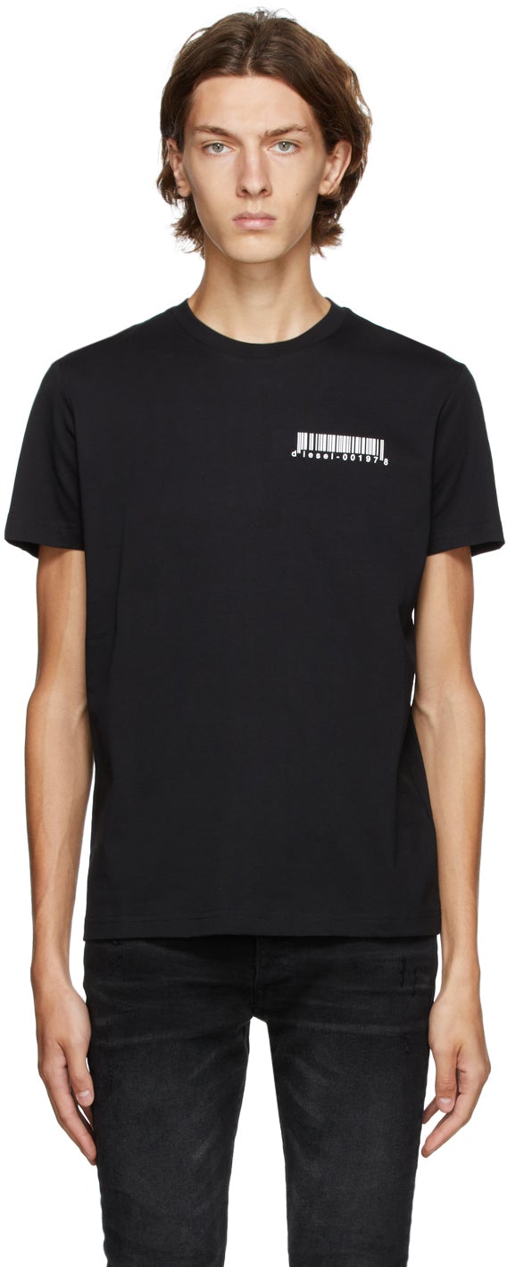 Short sleeve cotton jersey T-shirt in black. Rib knit crewneck collar. Logo and graphic bonded in white at chest. Supplier color: Black 100% cotton. Brand: Diesel