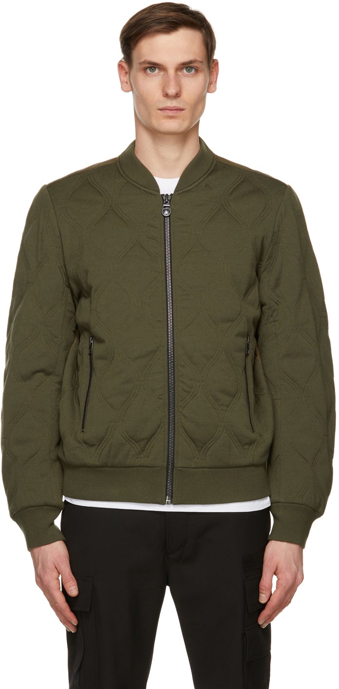 Long sleeve insulated quilted knit wool jacket in green. Rib knit stand collar, cuffs, and hem. Zip closure at front. Zippered pockets at waist. Tonal quilted nylon taffeta panel at back. Tonal knit cotton lining. Fully lined. Gunmetal-tone hardware. Supplier color: Khaki Body: 100% wool. Lining: 100% cotton. Trim: 100% nylon. Fill: 100% polyester. Brand: Diesel