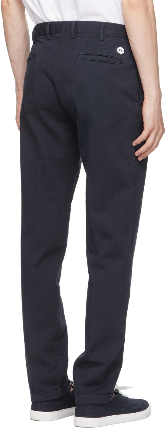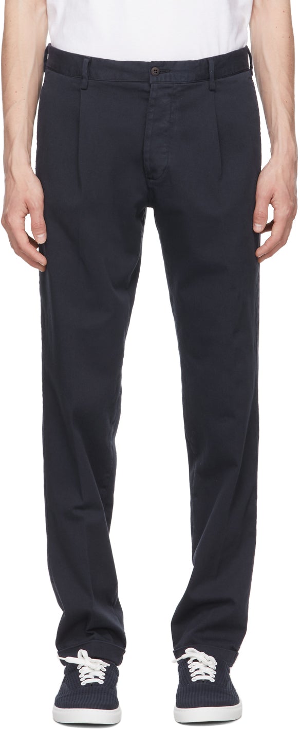 Straight-leg cotton-blend drill trousers in navy. Mid-rise. Fading throughout. Four-pocket styling. Belt loops at waistband. Pleats at front. Embroidered logo appliqué in white and black at back waistband. Central creases at back. Rolled cuffs. Button-fly. Brown hardware. Supplier color: Navy 63% cotton, 32% polyester, 5% polyurethane. Brand: DOPPIAA