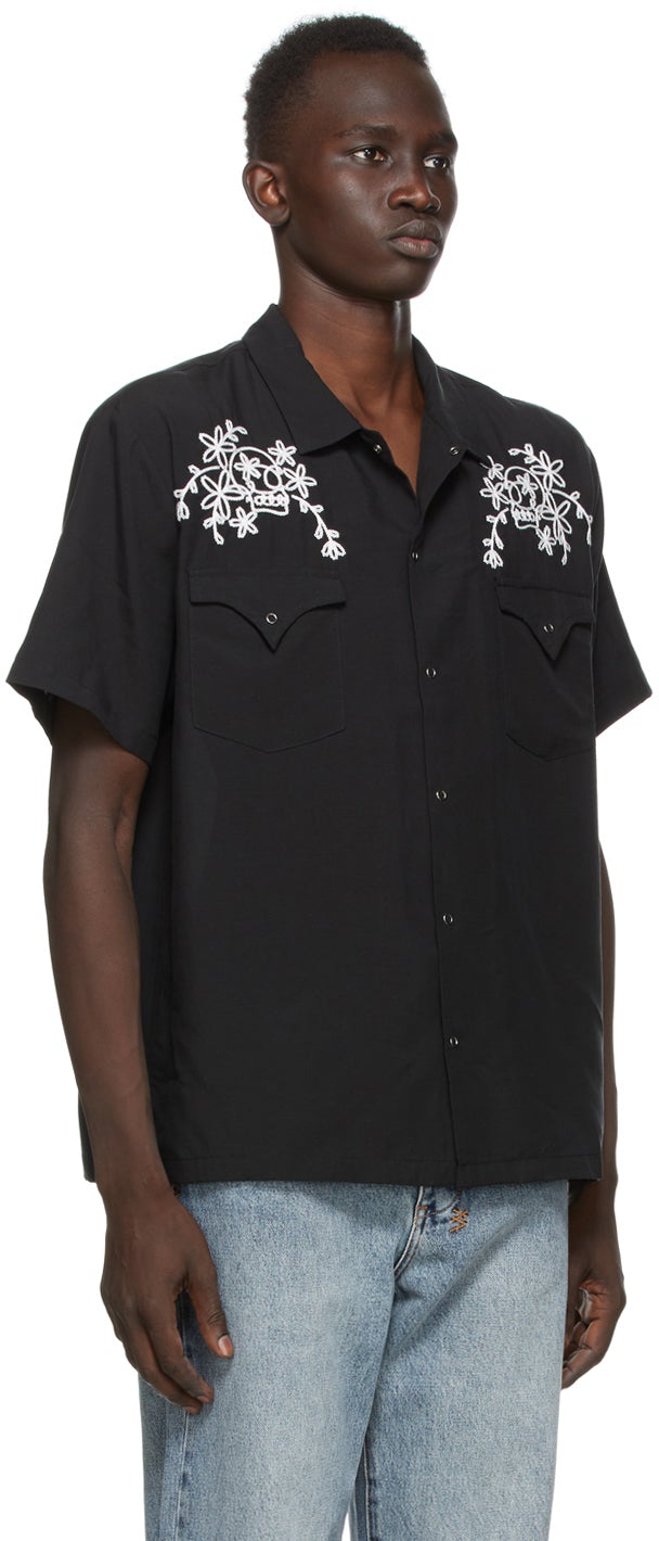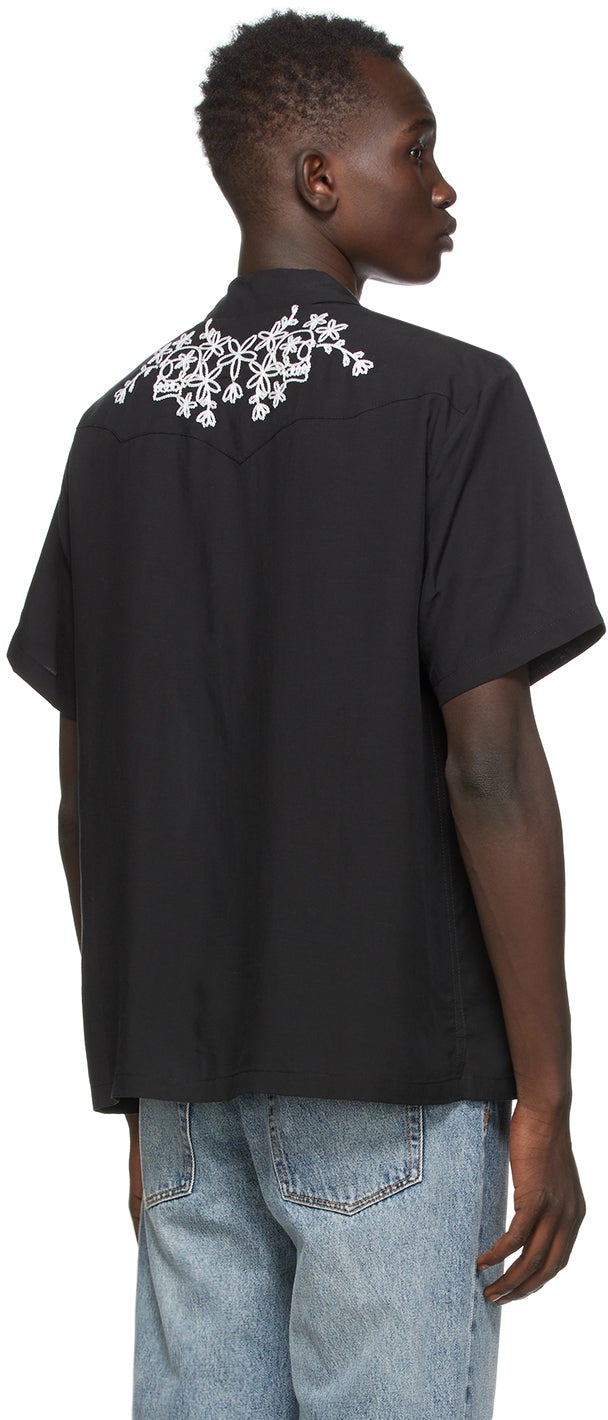 Short sleeve woven linen-blend shirt in black. Graphics embroidered in white throughout. Spread collar. Press-stud closure at front. Flap pockets at chest. Vented side-seams. Supplier color: Black 89% tencel, 11% linen. Brand: Double Rainbouu