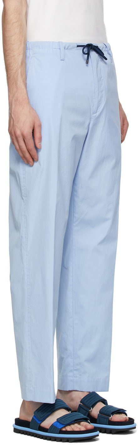 Straight-leg cotton poplin trousers in light blue. Mid-rise. Three-pocket styling. Drawstring in navy at waistband. Zip-fly. Supplier color: Light blue 100% cotton. Brand: Dries Van Noten