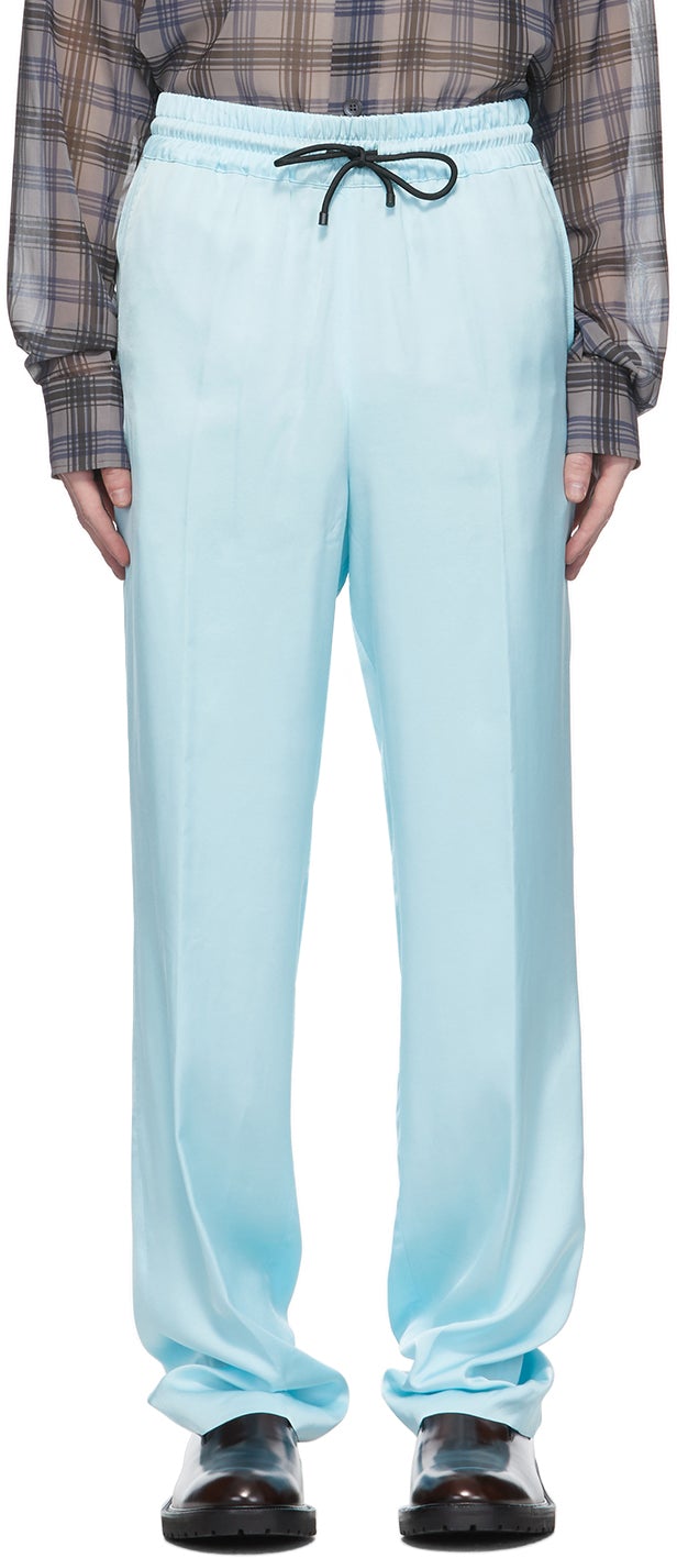 Straight-leg viscose jersey trousers in blue. Mid-rise. Three-pocket styling. Drawstring at elasticized waistband. Silver-tone hardware. Supplier color: Light blue 100% viscose. Brand: Dries Van Noten