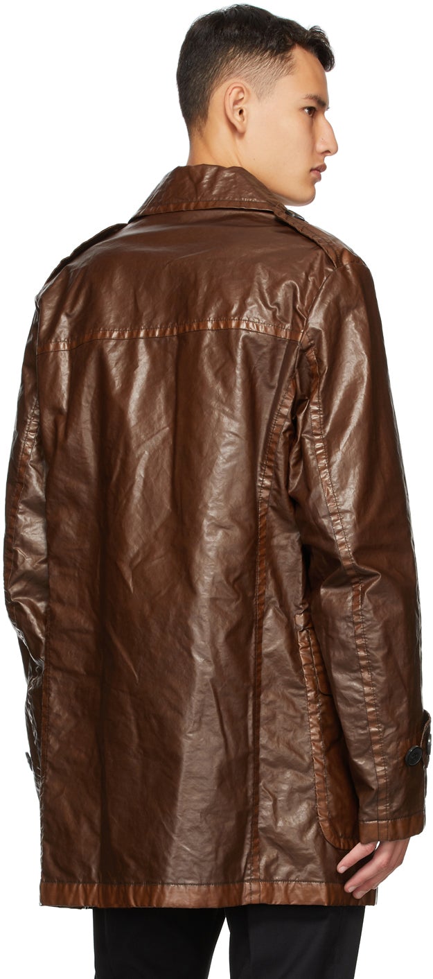 Long sleeve coated cotton coat in brown. Spread collar. Button closure at front. Flap pockets at waist. Buttoned epaulets. Adjustable button tab at cuffs. Welt pockets at interior. Fully lined. Black hardware. Supplier color: Brown Body: 63% cotton, 37% polyurethane. Lining: 43% cotton, 35% cupro, 20% polyester, 2% polyamide. Brand: Dries Van Noten