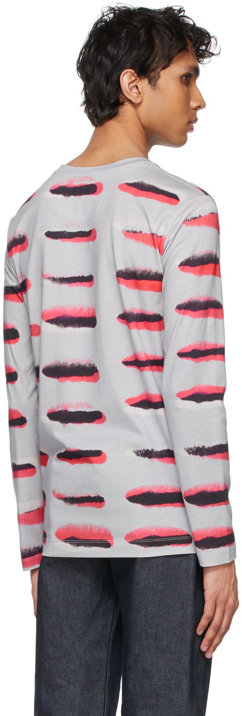Long sleeve cotton jersey T-shirt in grey featuring graphic pattern printed in tones of pink and black throughout. Crewneck collar. Part of the Dries Van Noten x Len Lye collaboration. Supplier color: Light grey 100% cotton. Brand: Dries Van Noten
