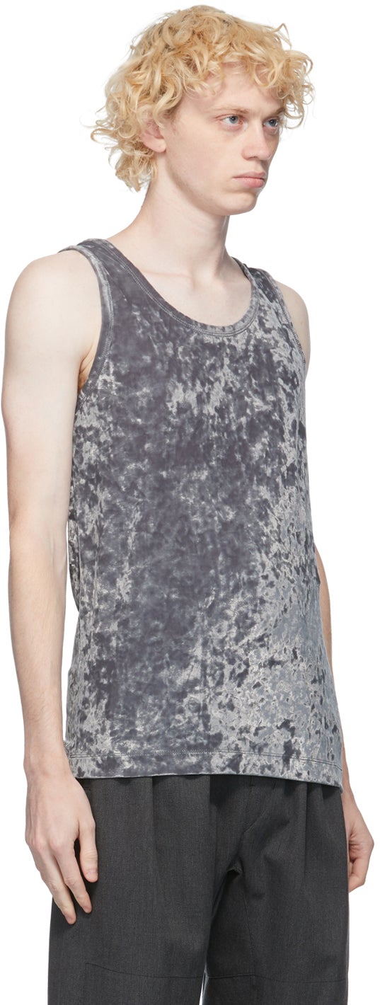 Sleeveless crushed velvet tank top in grey. Scoop neck collar. Supplier color: Grey 90% polyester, 10% polyurethane. Brand: Dries Van Noten