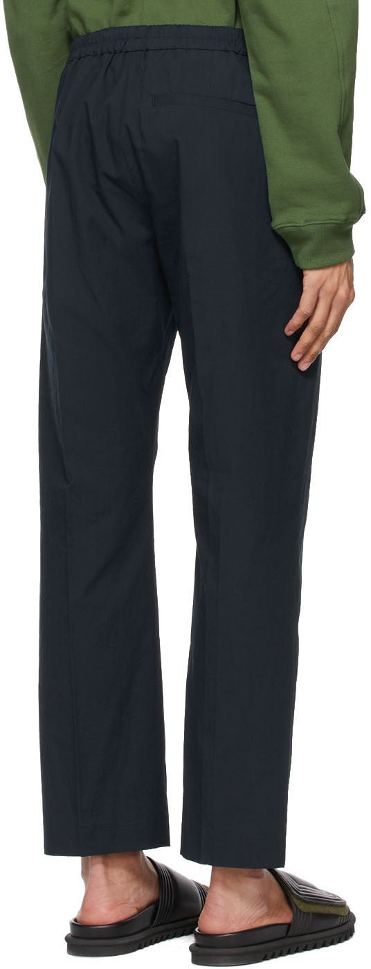 Slim-fit textured woven cotton trousers in navy. Mid-rise. Three-pocket styling. Concealed drawstring at waistband. Mock fly. Black hardware. Supplier color: Navy 100% cotton. Brand: Dries Van Noten
