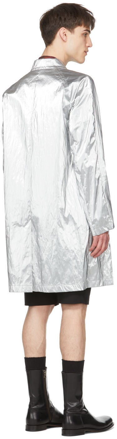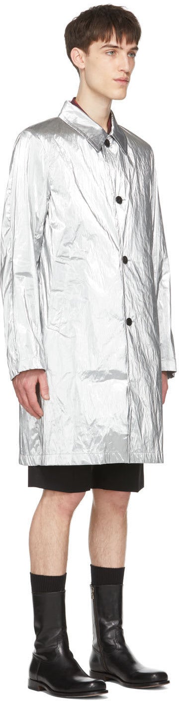Long sleeve crinkled taffeta coat in metallic silver-tone. Spread collar. Button closure at front. Welt pockets at waist. Central vent at back hem. Welt pocket at interior. Full bonded cotton jersey lining in white. Black hardware. Supplier color: Silver Body: 64% polyethylene, 36% polyurethane. Lining: 100% cotton. Brand: Dries Van Noten