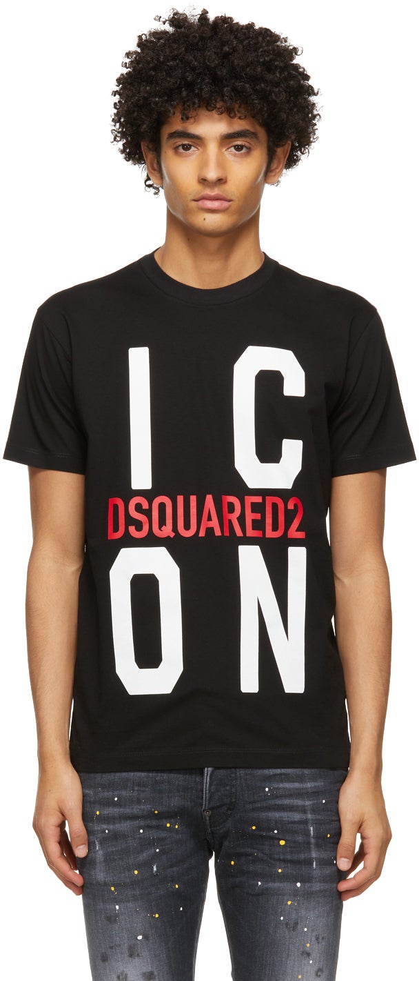 Short sleeve cotton jersey T-shirt in black. Rib knit crewneck collar. Bonded logo and text in red and white at front. Supplier color: Black 100% cotton. Brand: Dsquared2