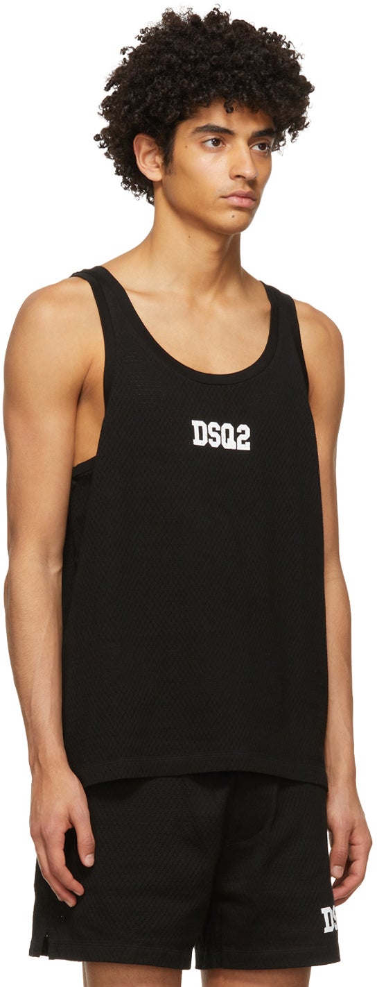 Sleeveless cotton mesh tank top in black. Rib knit scoop neck collar and armscyes. Logo printed in white at chest. Vented side-seams. Supplier color: Black 100% cotton. Brand: Dsquared2