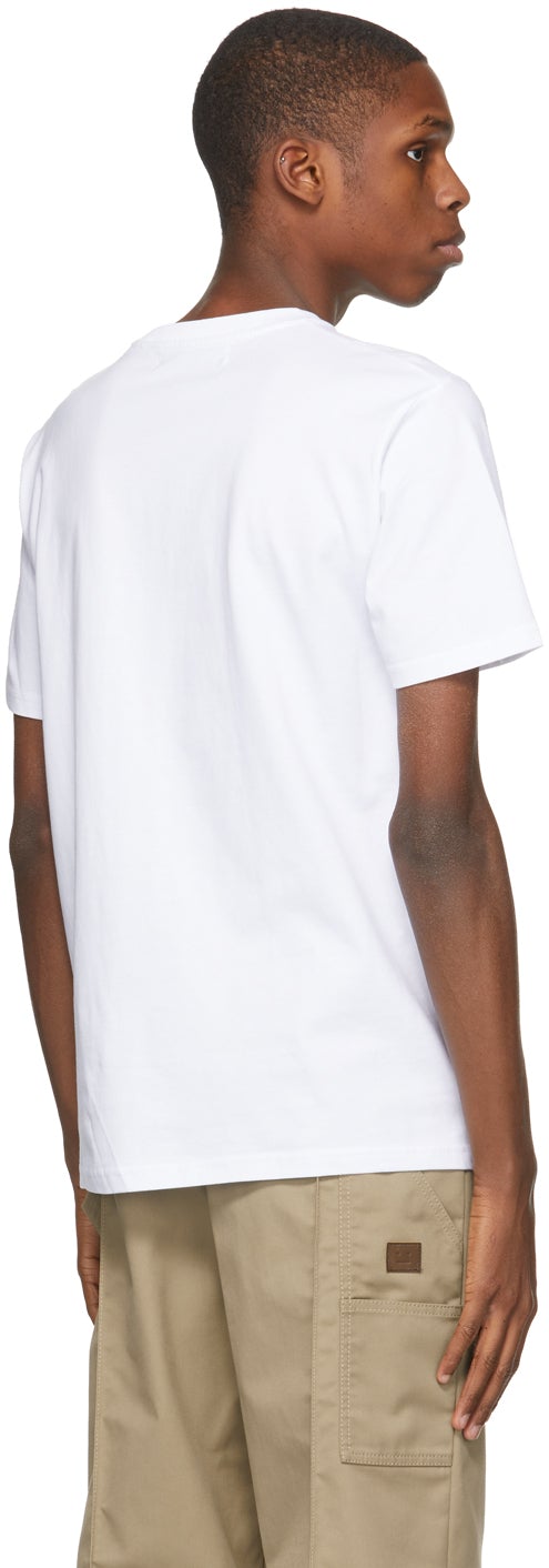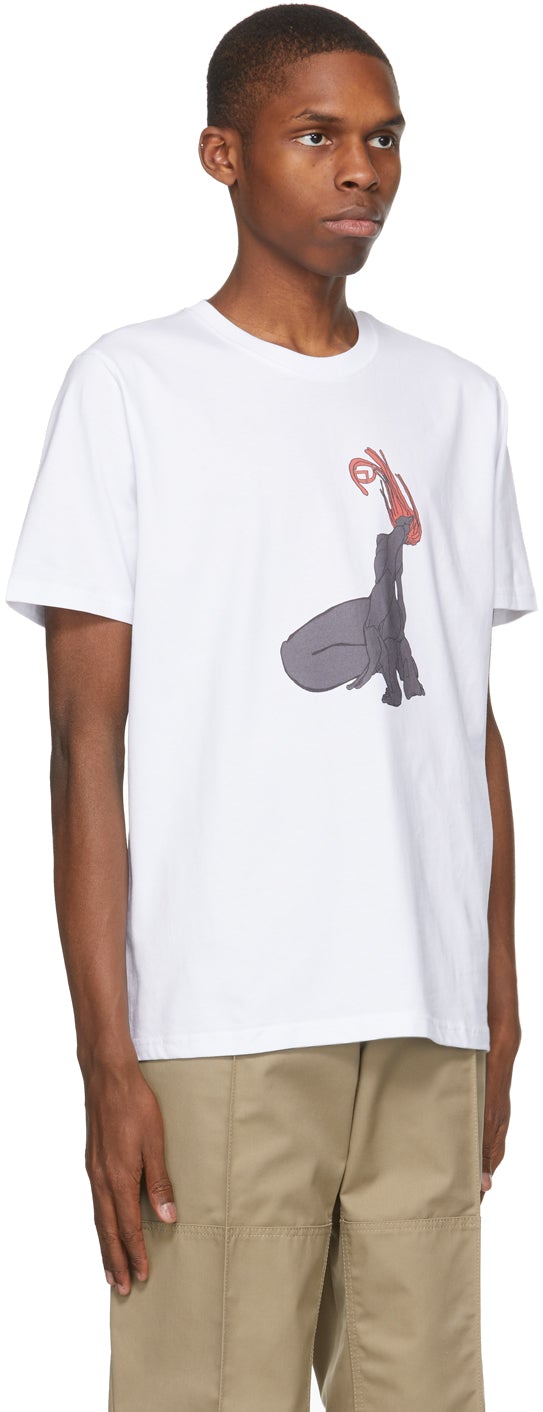 Short sleeve cotton jersey T-shirt in white. Rib knit crewneck collar. Graphic printed in orange, brown, and black at chest. Supplier color: White 100% organic cotton. Brand: Eastwood Danso