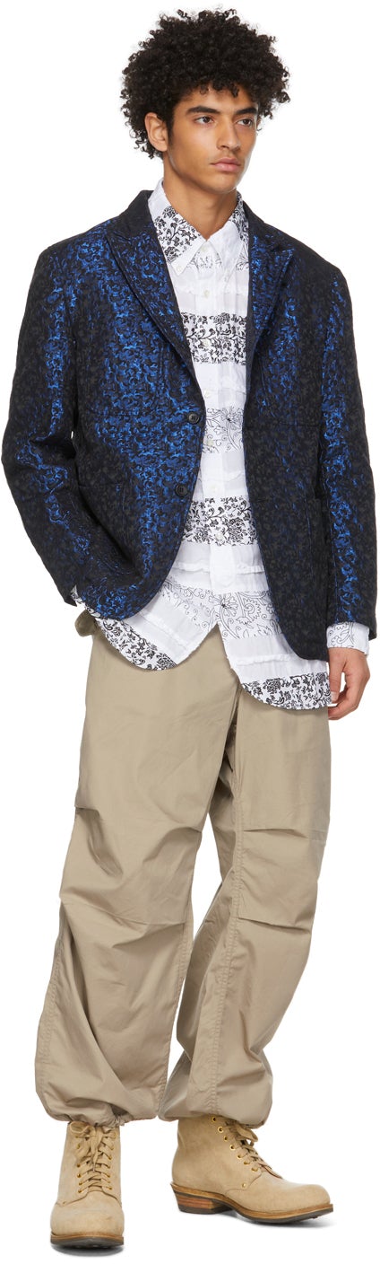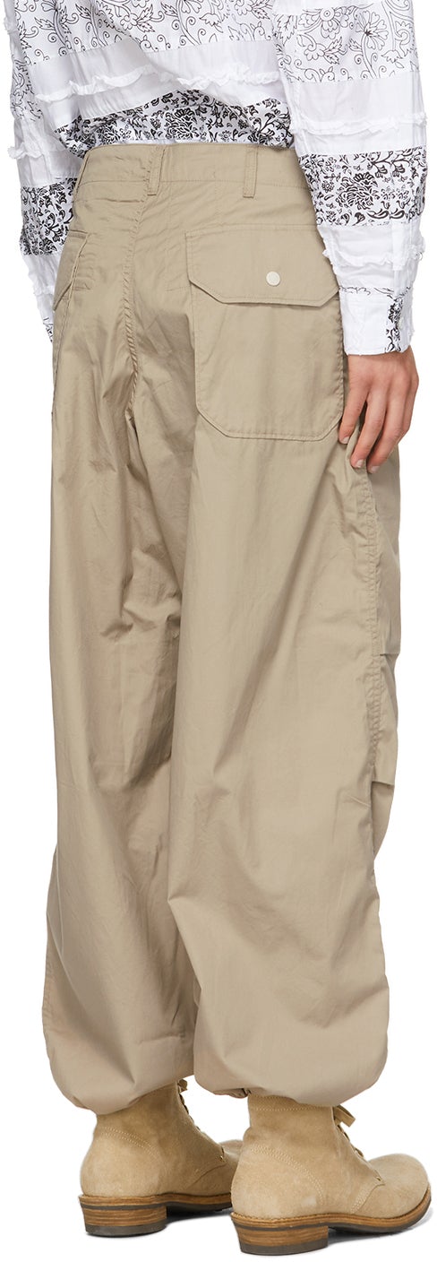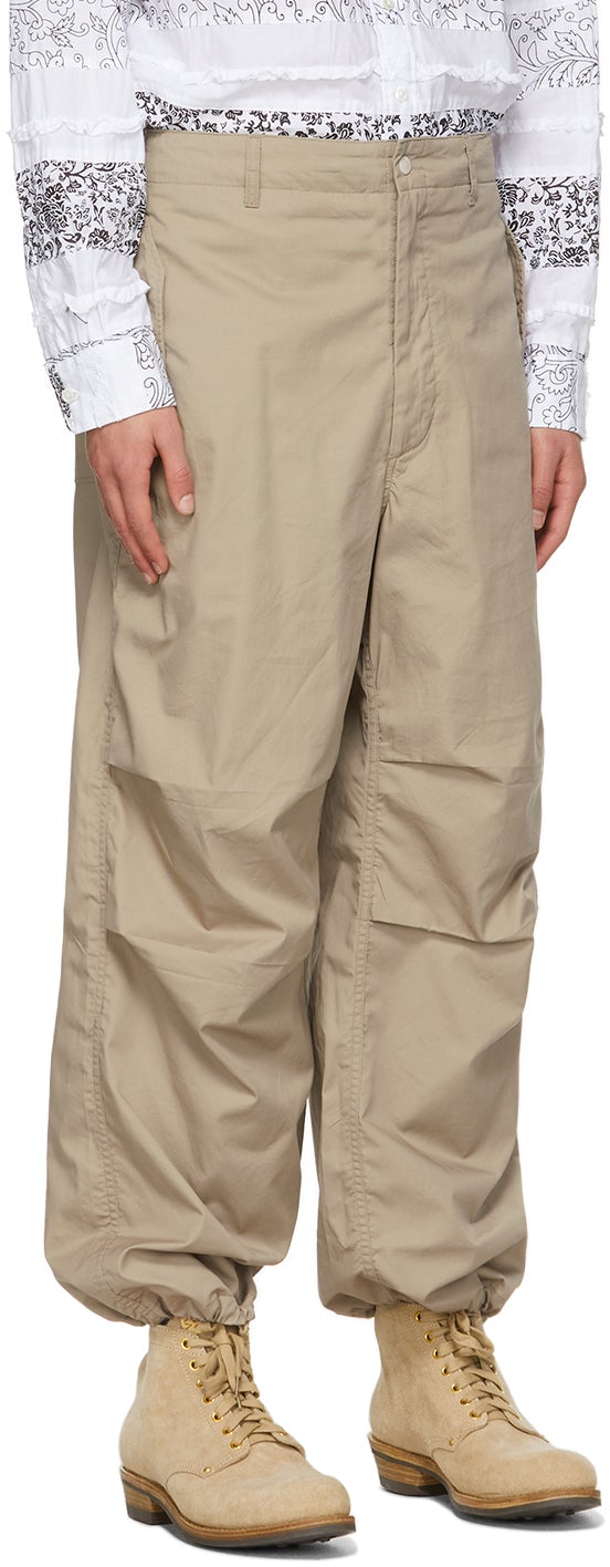 Straight-leg cotton twill trousers in beige. Mid-rise. Four-pocket styling. Belt loops and concealed drawstring at waistband. Zip-fly. Logo-engraved tonal hardware. Supplier color: Khaki 100% cotton. Brand: Engineered Garments