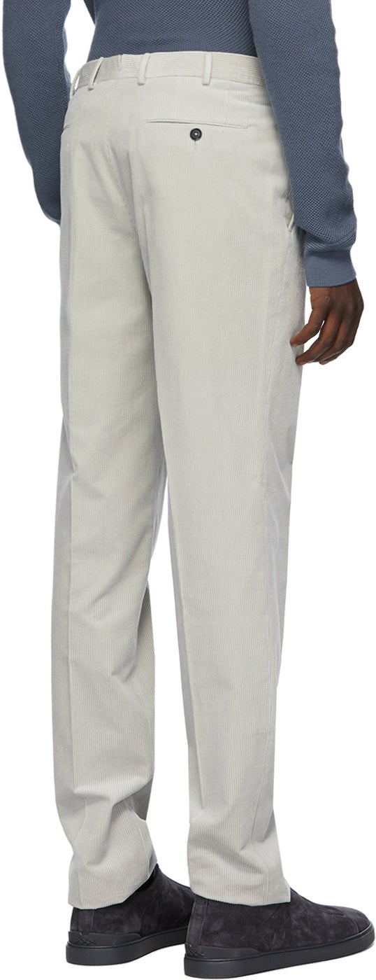 Slim-fit cotton and cashmere-blend corduroy trousers in grey. Mid-rise. Four-pocket styling. Belt loops at waistband. Central creases at front. Vent at back waistband. Unfinished hem. Unlined. Zip-fly. Tonal hardware. Supplier color: Off-White 91% cotton, 9% cashmere. Brand: Ermenegildo Zegna