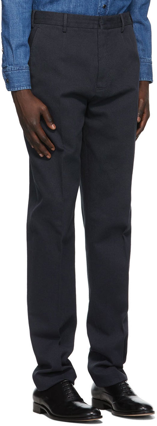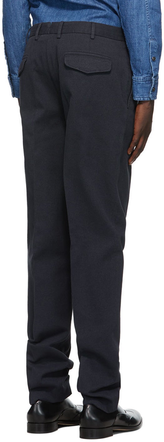 Tapered stretch cotton twill trousers in navy. Mid-rise. Four-pocket styling. Belt loops at waistband. Central crease at front and back. Unfinished cuffs. Zip-fly. Silver-tone hardware. Supplier color: Navy 98% cotton, 2% elastane. Brand: Ermenegildo Zegna