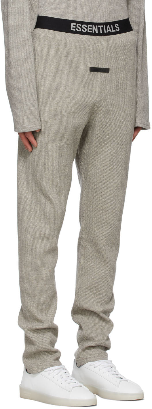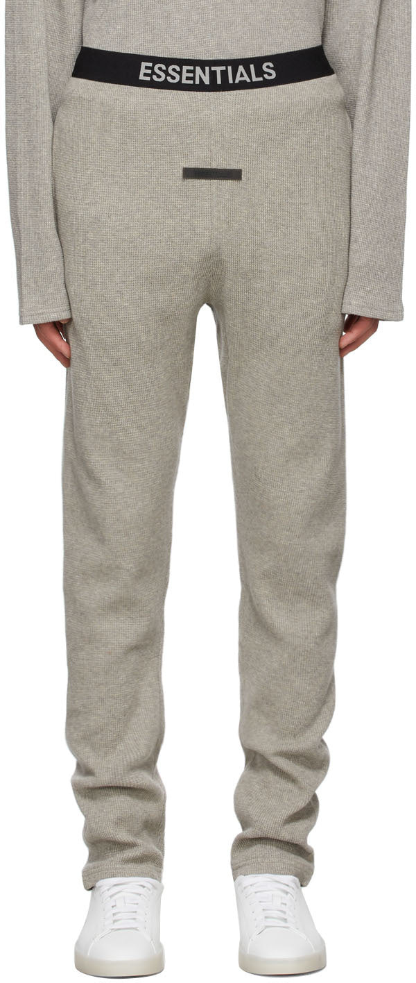 Slim-fit waffle knit cotton lounge pants in grey. Mid-rise. Two-pocket styling. Elasticized waistband in black with grey jacquard knit logo. Rubberized logo appliqué in black at front. Please note that this item may not be shipped within the EU. Supplier color: Heather oatmeal 100% cotton. Brand: Essentials
