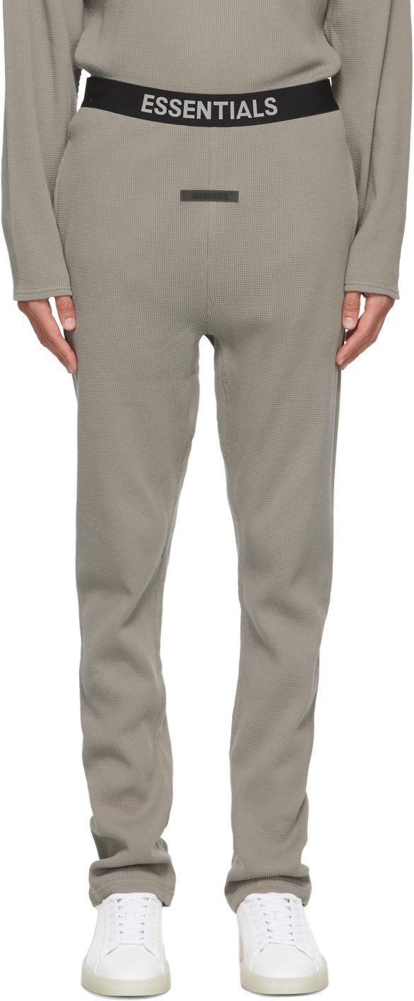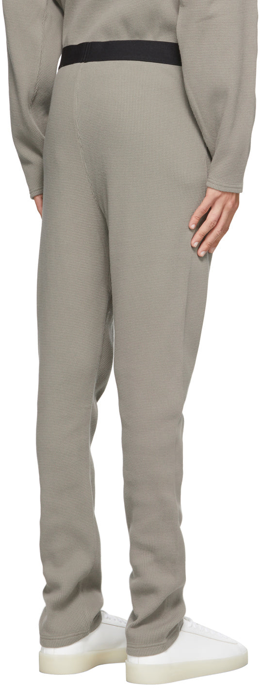 Slim-fit waffle knit cotton lounge pants in grey. Mid-rise. Two-pocket styling. Elasticized waistband in black with grey jacquard knit logo. Rubberized logo appliqué in black at front. Please note that this item may not be shipped within the EU. Supplier color: Charcoal 100% cotton. Brand: Essentials
