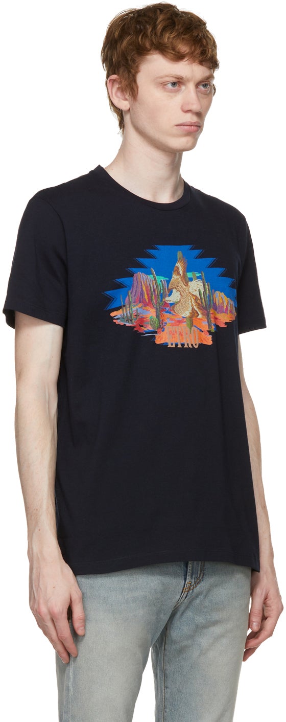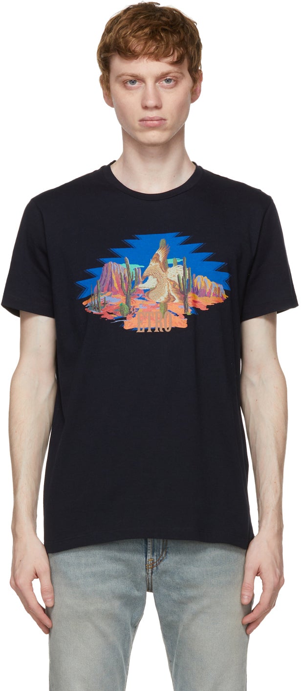 Short sleeve cotton jersey T-shirt in navy. Rib knit crewneck collar. Multicolor printed graphic and logo bonded in beige at front. Supplier color: Blue Body: 100% cotton. Trim: 100% viscose. Brand: Etro