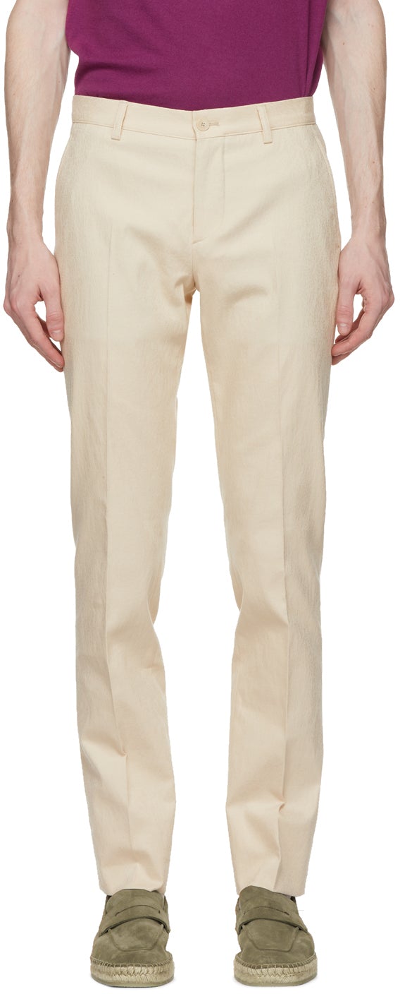 Slim-fit stretch cotton twill trousers in off-white featuring tonal jacquard woven graphic pattern. Mid-rise. Four-pocket styling. Belt loops at waistband. Central creases at front and back. Unfinished hem. Zip-fly. Tonal logo-engraved hardware. Supplier color: White 98% cotton, 2% elastane. Brand: Etro