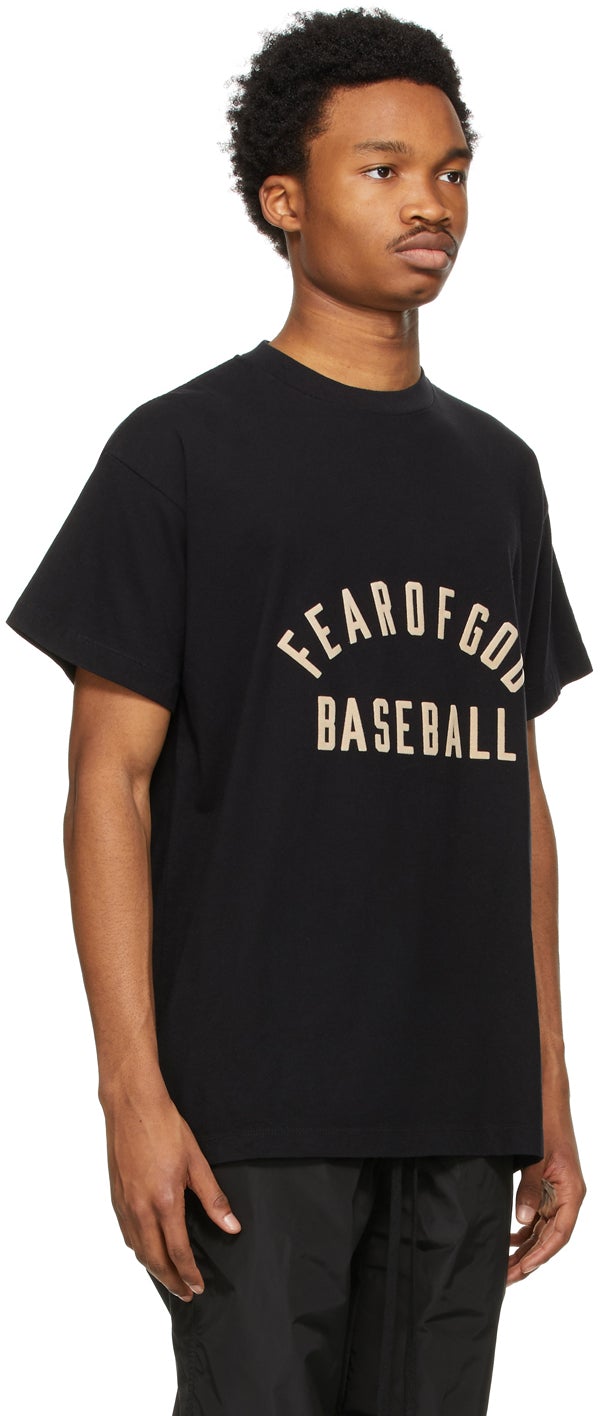 Short sleeve cotton jersey T-shirt in black. Rib knit collar. Logo and text flocked in beige at front. Tonal embossed logo appliqué at back collar. Supplier color: Black 100% cotton. Brand: Fear of God