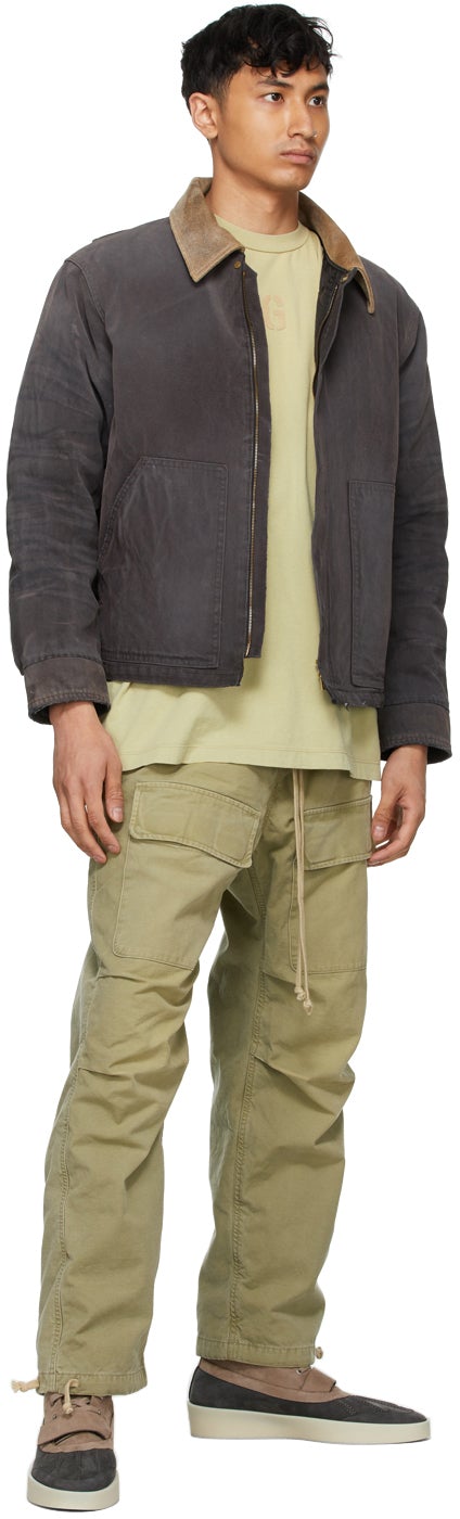 Short sleeve cotton jersey T-shirt in green. Fading throughout. Rib knit crewneck collar. Tonal logo flocked at front. Embossed leather logo patch in black at back collar. Part of the Fear of God The Seventh Collection. Supplier color: Vintage matcha 100% cotton. Brand: Fear of God