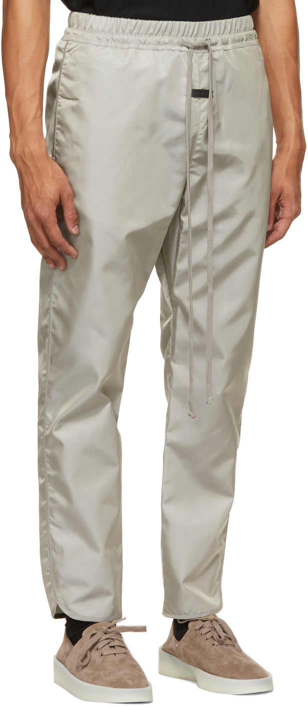 Slim-fit nylon-blend twill track pants in grey. Mid-rise. Four-pocket styling. Drawstring at elasticized waistband. Embossed leather logo patch in black at front. Vent at cuffs. Supplier color: Grey iridescent Body: 68% nylon, 32% polyester. Trim 1: 100% cotton. Trim 2: 65% polyester, 35% polyurethane. Brand: Fear of God