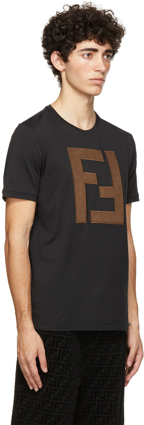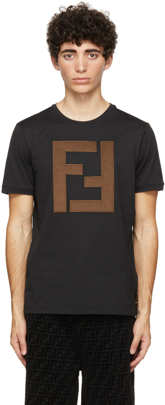 Short sleeve cotton jersey T-shirt in black. Rib knit crewneck collar. Felted logo patch in tan at front. Logo flag in black at hem. Supplier color: Black 100% cotton. Brand: Fendi