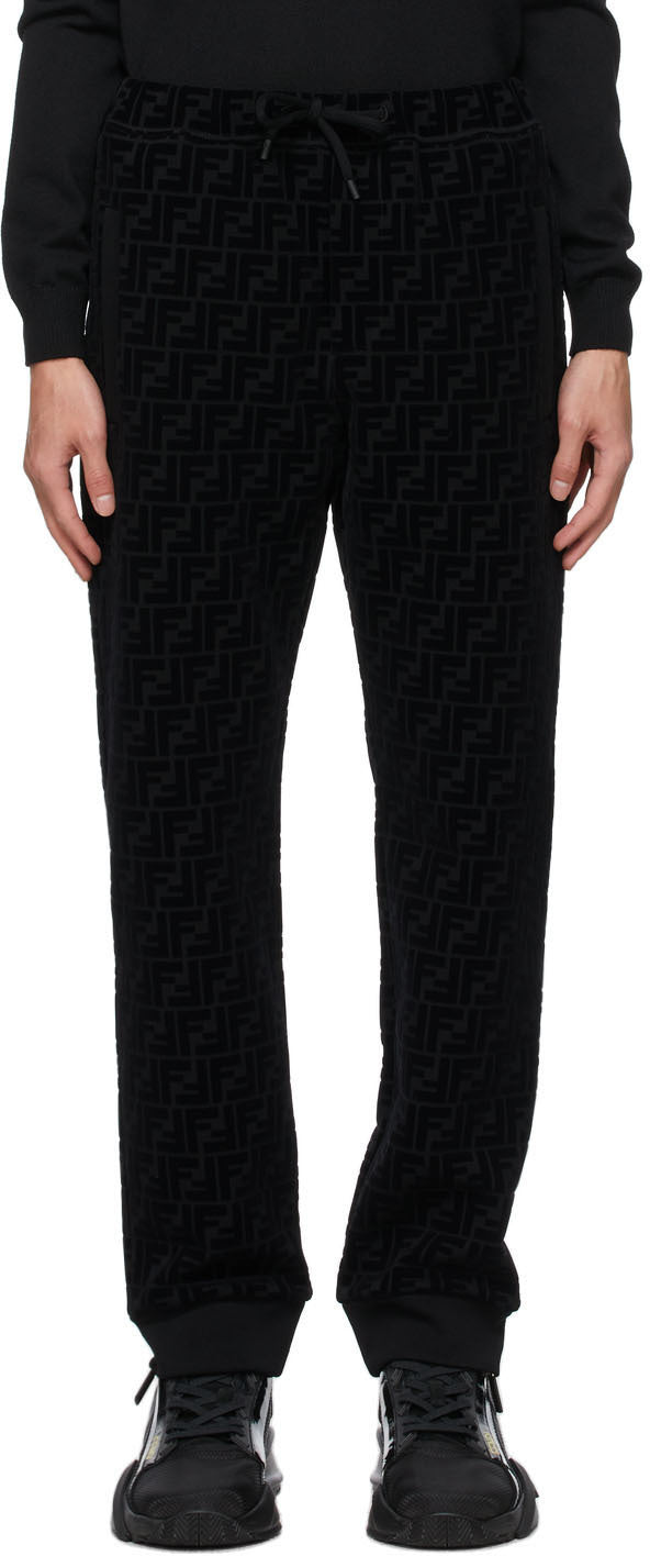 Tapered cotton piqué lounge pants in black featuring tonal felted logo pattern throughout. Mid-rise. Three-pocket styling. Drawstring at elasticized waistband. Rib knit cuffs. Gunmetal-tone hardware. Supplier color: Black Body: 100% cotton. Trim: 100% polyamide. Brand: Fendi