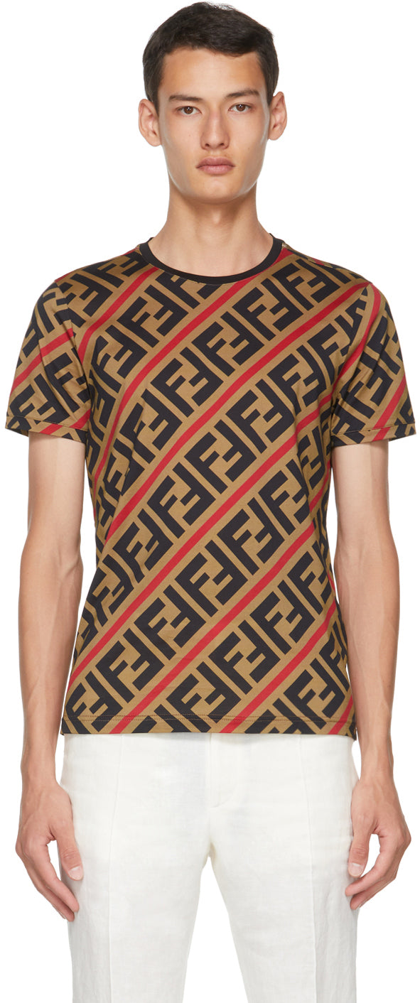 Short sleeve cotton jersey T-shirt in brown featuring striped pattern in red and logo pattern in black. Rib knit crewneck collar and cuffs. Vented side-seams. Supplier color: Hazelnut/Berry 100% cotton. Brand: Fendi