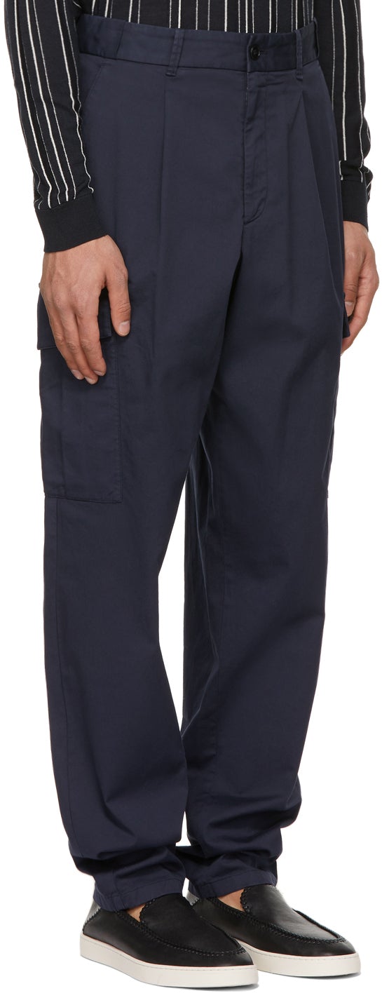 Tapered stretch cotton gabardine cargo pants in navy. Mid-rise. Four-pocket styling. Belt loops at waistband. Pleats at front waistband. Patch pocket and flap pocket at outseams. Zip-fly. Logo-engraved silver-tone hardware. Supplier color: Blue 97% cotton, 3% elastane. Brand: Giorgio Armani