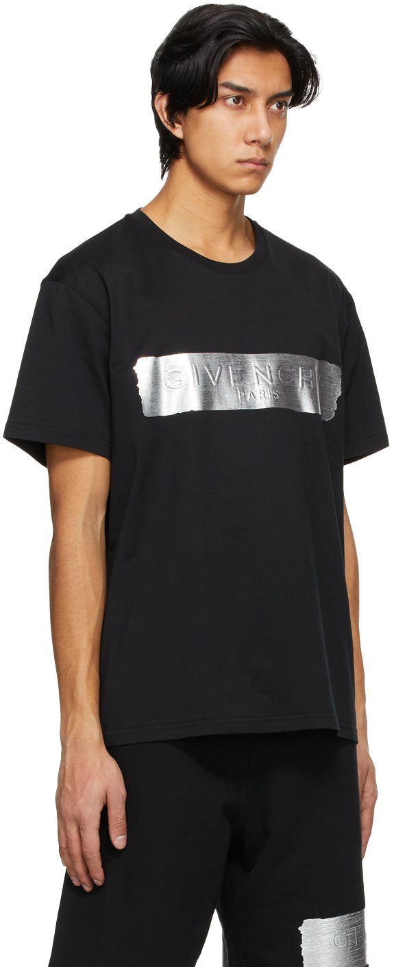 Short sleeve cotton jersey T-shirt in black. Rib knit crewneck collar. Rubberized trim in silver-tone featuring embossed logo at chest. Supplier color: Black 100% cotton. Brand: Givenchy