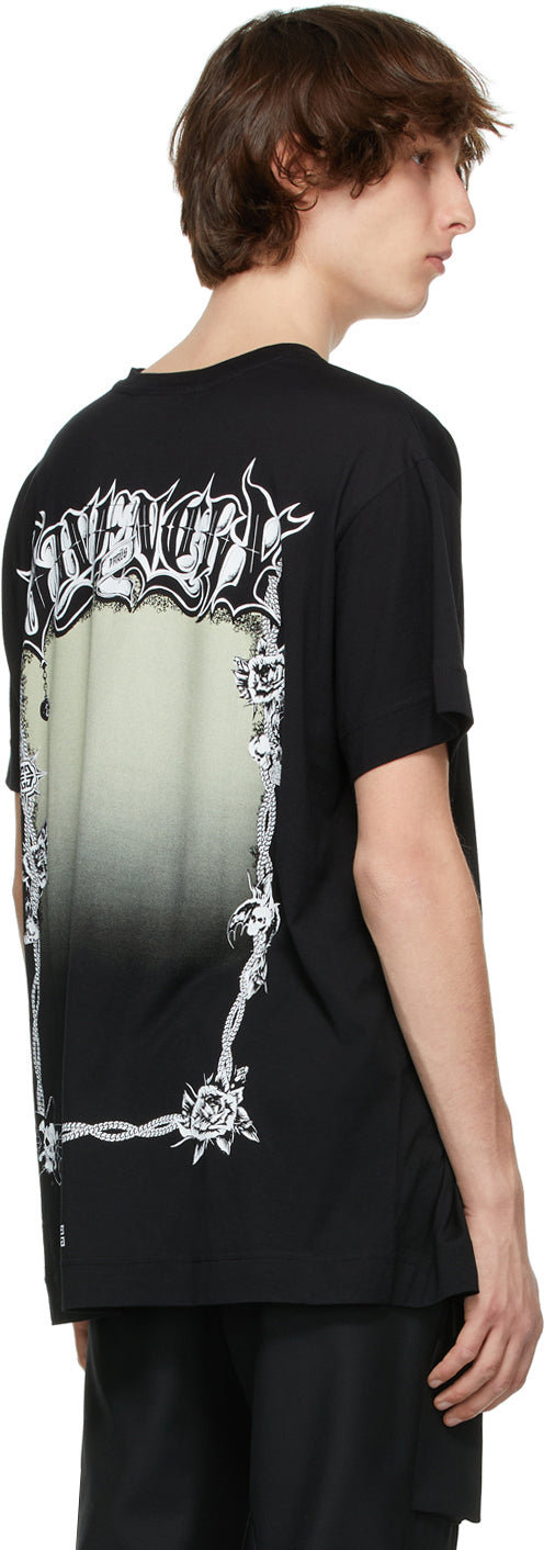 Short sleeve cotton jersey T-shirt in black. Rib knit crewneck collar. Logo printed in white at chest. Logo and graphic printed in white and tones of green at back. Supplier color: Black 100% cotton. Brand: Givenchy