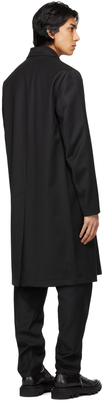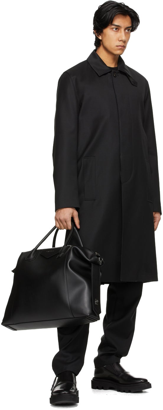 Long sleeve wool twill trench coat in black. Spread collar. Concealed button closure at front. Welt pockets at waist. Tonal satin logo tape at cuffs. Tonal logo-woven satin lining. Supplier color: Black Body: 100% wool. Trim: 51% cupro, 49% viscose. Lining: 100% curpo. Brand: Givenchy