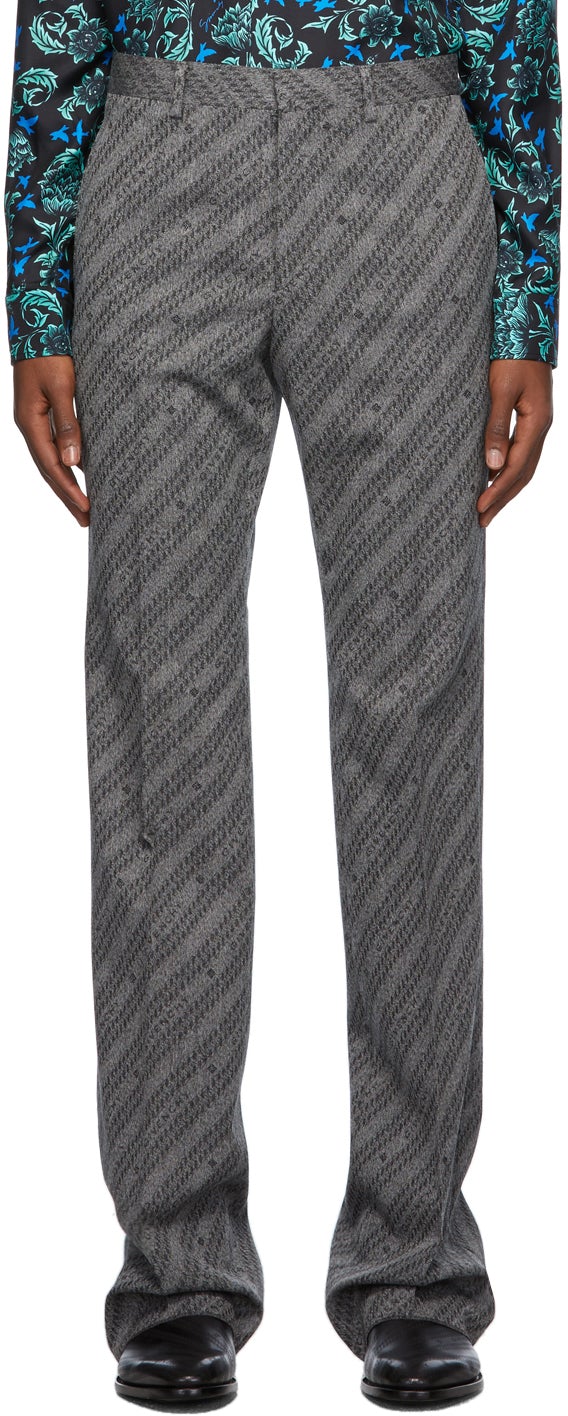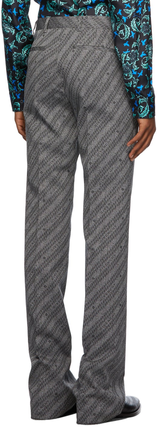Slim-fit wool trousers featuring jacquard knit logo and graphic pattern throughout. Flared-leg. Mid-rise. Four-pocket styling. Belt loops at waistband. Central crease at legs. Logo-engraved hardware at back belt loop. Partial satin lining in black. Zip-fly. Tonal hardware. Supplier color: Grey Body: 100% wool. Lining: 60% acetate, 40% cupro. Brand: Givenchy